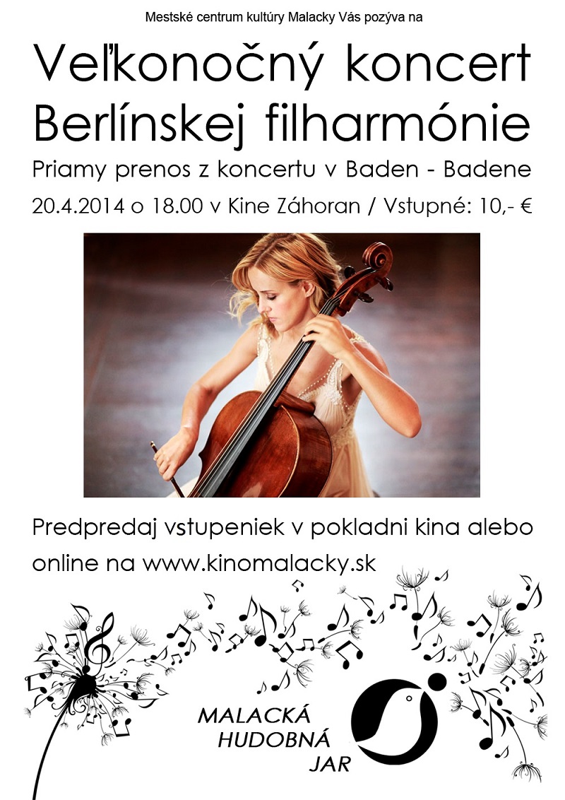 Dôstojným ukončením 50. Malackej hudobnej jari bude unikátny prenos z Veľkonočného festivalu 2014 v Baden-Badene. VEĽKONOČNÝ KONCERT BERLINSKEJ FILHARMÓNIE, v priamom prenose pod taktovkou Sira Simona Rattlea bude uvedený v kine Záhoran na veľkonočnú nedeľu 20. 4. 2014 o 18.00 hod. Na koncerte zaznie vedľa Ligetiho a Wagnera i Elgarov violončelový koncert v podaní hviezdnej hosťujúcej violončelistky Sol Gabetty, ktorý je právom pokladaný za jednu z Elgarových najcennejších skladieb. Koncert vygraduje pohanským Svätením jari Igora Stravinského. Tento jedinečný koncert sa bude na Slovensku premietať iba v troch kinách a veríme, že bude fantastickou bodkou za 50. Malackou hudobnou jarou. Srdečne vás pozývame.