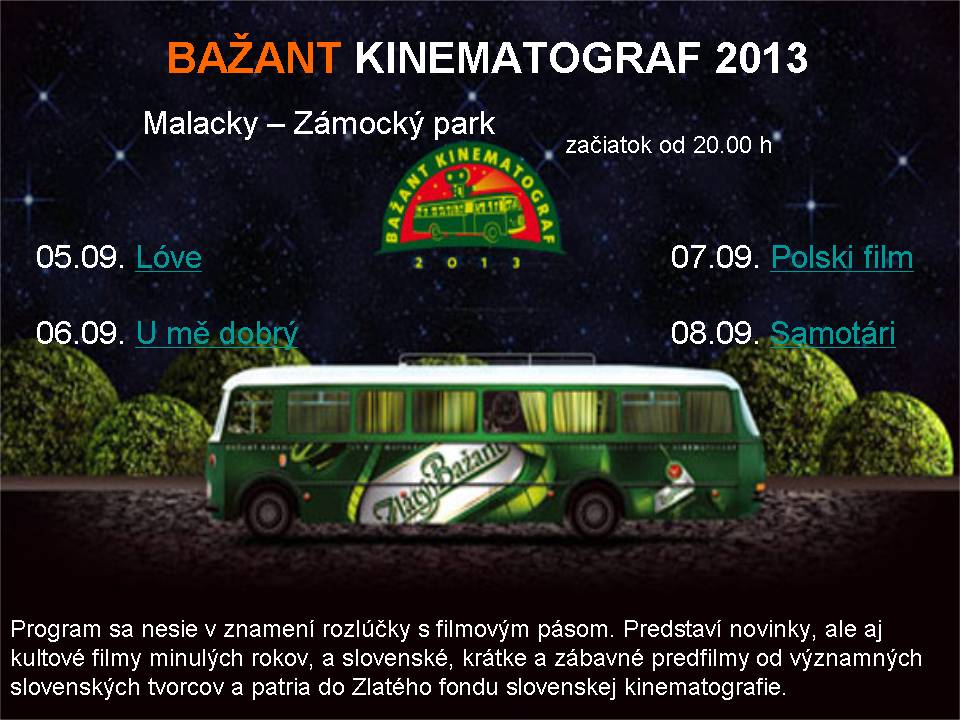 Bažant kinematograf v Malackách ukončí v nedeľu 8. 9. tragikomédia SAMOTÁRI. Film Davida Ondříčka je o siedmich mladých ľuďoch vo veľkom meste na konci 90. rokov, ktorí sa pokúšajú o niečo, čomu sa kedysi hovorilo milostný vzťah. Namiesto naplnenej lásky sa však ocitajú v kruhu absurdných situácií. Každý z nich prežíva svoje drobné radosti i sklamania, všetci osve, no navzájom úzko prepojení. Hanka, Vesna, Lenka, Robert, Petr, Jakub, Ondřej sú spolu, no sú samotári a kladú si otázku: „Prečo nevieme nájsť lásku?“. Snímka sa zaradila medzi kultové tituly mladej generácie a Bažant Kinematograf ju prináša vo svojom programe po desiatich rokoch. Pred filmom sa premieta Socha.