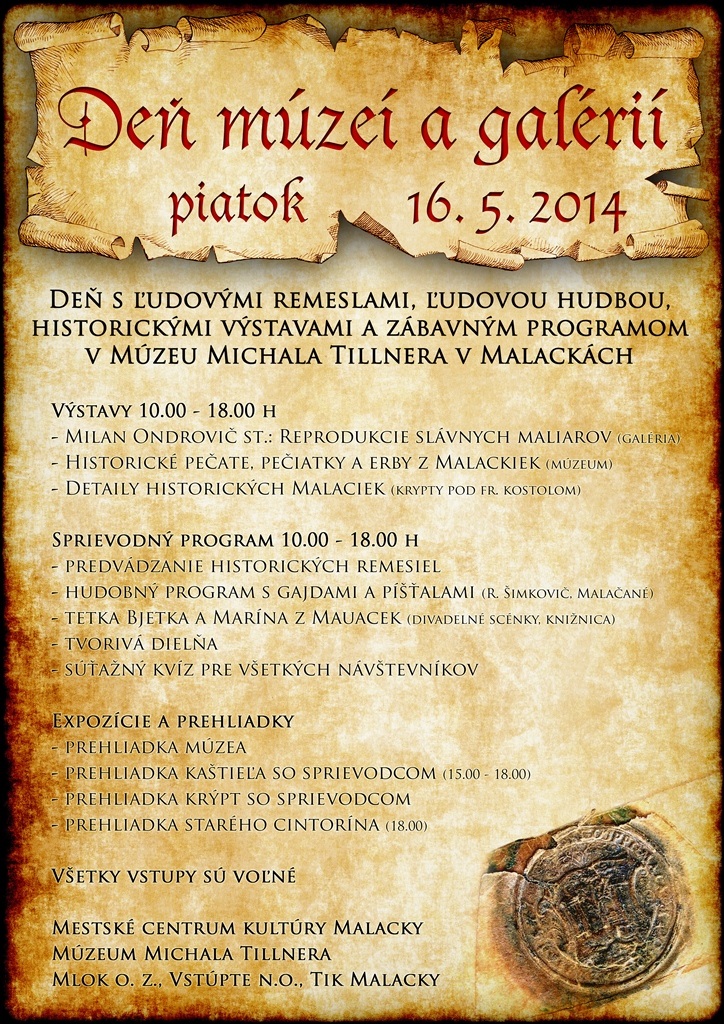 Záver Dňa múzeí a galérií (16.00 – 17.00 h) bude patriť malackej dychovej kapele Malačané a o 18.00 h sa uskutoční komentovaná prehliadka starého cintorína v Malackách. Všetky vstupy do múzea, galérie, krýpt i expozície v kaštieli budú voľné.