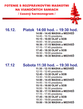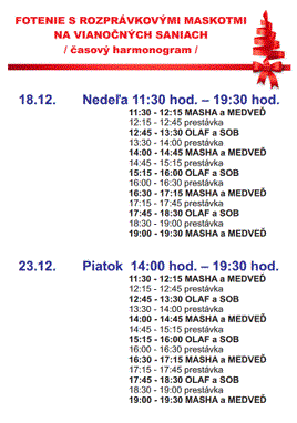 Rodičia môžu prekvapiť svoje deti a priamo vo vianočnej dedinke budú pripravení pri sánkach Máša a medveď, okrem nich aj snehuliak Olaf. Ak chcú rodičia využiť aj službu fotografa, môžu si za 1,5 eura urobiť spoločnú rodinnú fotografiu na sánkach či za 2 eurá vyvolať fotografiu vo forme fotopohľadnice z Vianočných trhov.