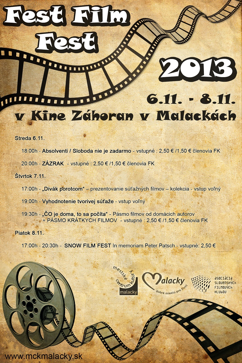 Milovníci kvalitných filmov pozor! Nenechajte si ujsť filmový festival FEST FILM FEST, súčasťou ktorého bude aj SNOW FILM FEST In memoriam Peter Patsch. Festival potrvá tri dni, 6. - 8. 11. v Kultúrním domečku (kino Záhoran, Hviezdoslavova 3).