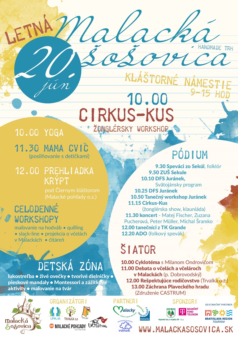 Do Malaciek zavíta Cirkus-Kus s cirkusovým workshopom pre celú rodinu! Naučíte sa roztočiť tanierik, žonglovať so šatkami či loptami, prejsť sa po lane a mnohé ďalšie cirkusantské kúsky a triky. Žongléri sa na pódiu predstavia s novou tutti frutti fungl novou žonglérsku show o dvoch performeroch, plnú žonglovania a klauniády.