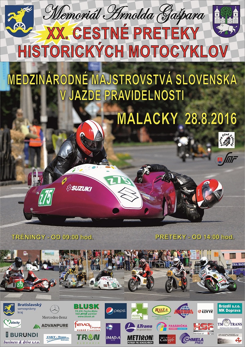 "Srdečne vás pozývame na XX. ročník historických cestných motocyklových pretekov pod názvom - Memoriál Arnolda Gašpara, ktoré sa konajú opäť - v Malackách 28. augusta. Krása historických motocyklov a sidecar, vôňa benzínu a to, že účasť potvrdilo viac ako 80 jazdcov z piatich krajín zaručuje kvalitný motoristický a športový zážitok," odkazujú organizátori.