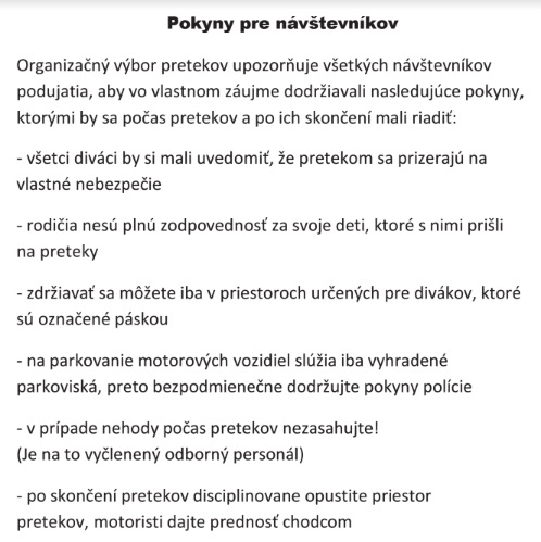 Zároveň vyzývajú každého, kto by mal záujem byť priamo v dianí pretekov v úlohe traťového komisára, nech sa prilási u Vladimíra Bluska 0905 462 985 alebo e-mailovej adrese 0905 462 985. Organizátori ponúkajú odmenu 20 eur v hotovosti a občerstvenie počas celého dňa.