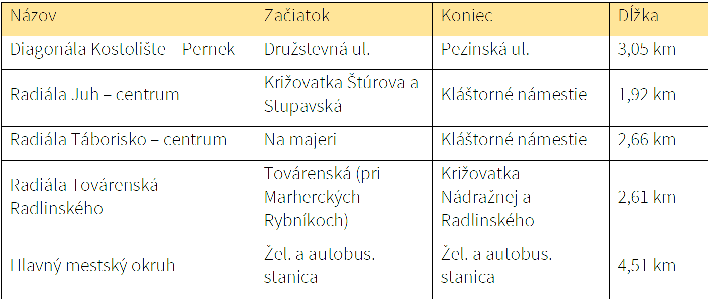 Základnú nosnú sieť mesta by malo tvoriť 5 hlavných cyklistických trás, pričom diagonála Kostolište – Pernek (vedúca cez Zahorácku a Radlinského ulicu) predstavuje tzv. hlavnú priečnu os, na ktorú sa z ostatných častí mesta napájajú jednotlivé radiály. Cyklistov distribuuje do siete tzv. hlavný mestský okruh. Celková dĺžka hlavných cyklistických trás je 14,74 km.