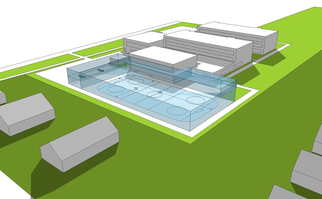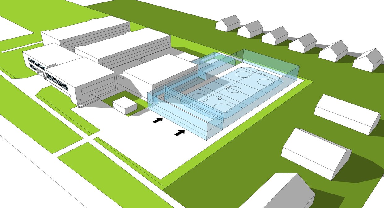 Nová športová aréna by sa mala rozprestierať na veľkosti plochy zhruba 5000 m2 a obsahovať by mala ľadovú plochu o rozmeroch 26x56 m. Situovanie stavby napriek tomu umožňuje zachovať viac ako 7 metrový odstup od hranice okolitých pozemkov. Vybudované by mali byť nové šatne, základná tribúna a bufet s výhľadom na hraciu plochu.