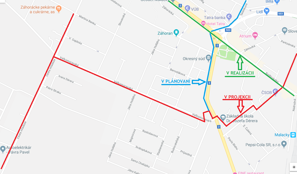 Schéma vzájomne prepojených cyklotrás - plánovaná (Mierové námestie - Sasinkova), v projekcii (Partizánska - Cesta mládeže) a pred realizáciou (Družstevná - Radlinského).
