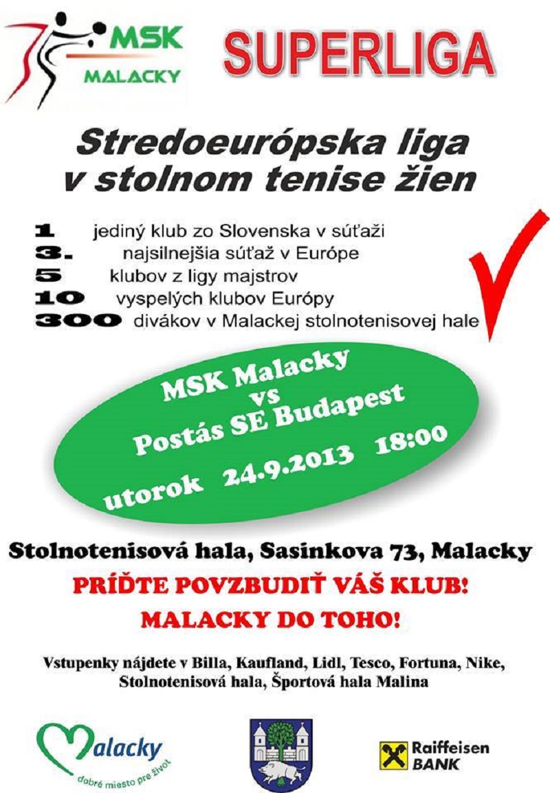Zajtra (24. 9.) sa v Stolnotenisovej hale na Sasinkovej o 18.00 h uskutoční stretnutie superligy žien v stolnom tenise, v ktorom sa predstaví domáce družstvo MSK Malacky proti maďarskému Postás SE Budapest. Náš tím v sezóne 2013/2014 ako jediný slovenský klub hrá superligu žien. Malacky reprezentujú Monika Haringová, Natália Kosová, Simona Lazarčíková, Evgenija Mugurdumova, Dominika Vizinová a Ivana Weberová. Príďte ich povzbudiť.