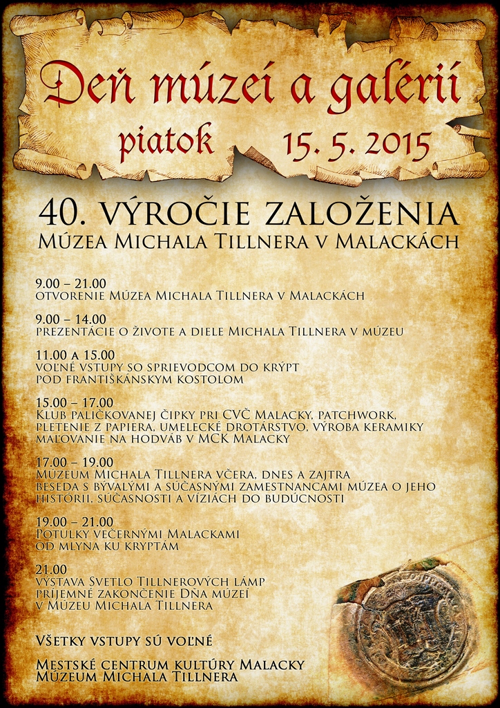 Program začína v piatok 15. mája 2015 otvorením a voľným vstupom do Múzea Michala Tillnera. O 11.00 h a 15.00 h budú voľné vstupy so sprievodcom do krýpt pod františkánskym kostolom. Medzi 15.00 h a 17.00 h budú svoje výrobky a pracovné postupy prezentovať umeleckí remeselníci – Klub paličkovanej čipky pri CVČ Malacky, patchwork, pletenie z papiera, umelecké drotárstvo, výroba keramiky, maľovanie na hodváb. Program pokračuje o 17.00 h besedou s bývalými a súčasnými pracovníkmi, priateľmi a podporovateľmi múzea o jeho histórii, súčasnosti a víziách do budúcnosti, po ktorej budú o 19.00 h nasledovať obľúbené Potulky večernými Malackami (od Froncovho mlyna ku kryptám). Zakončenie slávnostného dňa bude opäť v priestoroch múzea výstavou Svetlo Tillnerových lámp a príjemným posedením pri rozsvietených desiatkach petrolejových lámp.