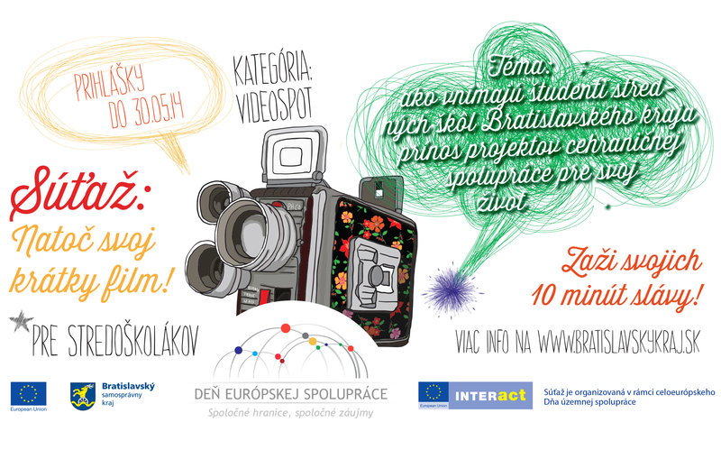 Natoč svoj krátky film! je nová súťaž, ktorú pripravila Bratislavská župa spoločne s operačným programom INTERACT II pre študentov stredných škôl. Stačí, ak školáci do dvojminútového videa zachytia, ako vidia a vnímajú prínos projektov cezhraničnej spolupráce pre svoj život. Na víťazov čakajú hodnotné ceny.„Táto súťaž má otvoriť mladým talentom dvere nielen do sveta filmov ale aj Európy,“ povedal predseda Bratislavského kraja Pavol Frešo. Súťaženiachtiví študenti sa môžu prihlásiť najneskôr do 30. mája elektronicky na adresu ecday@region-bsk.sk, kde uvedú svoje meno, priezvisko, školu, na ktorej študujú, triedu a kategóriu, v ktorej chcú súťažiť.