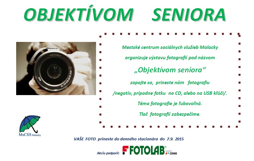 Mestské centrum sociálnych služieb organizuje výstavu fotografií pod názvom Objektívom seniora. Môžete sa do nej zapojiť aj Vy. Stačí priniesť fotografiu na nosiči do 7. septembra do denného stacionára MsCSS, jej vyhotovenie zabezpečí centrum. MsCSS - 17.08.2015 - 4549 čítaní