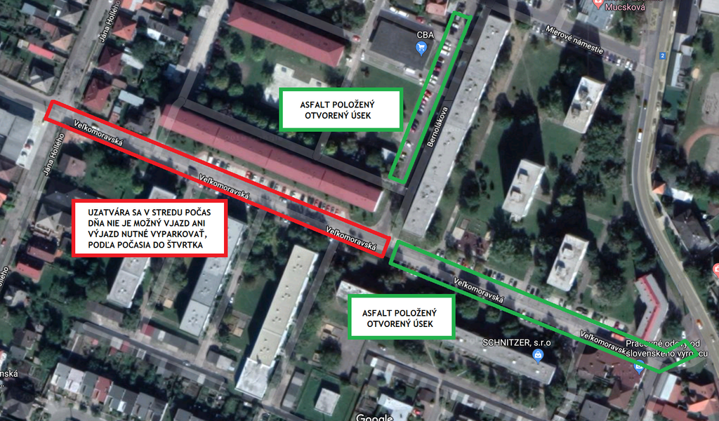 Práce na sfaltovaní budú pokračovať od piatka 17. augusta v úseku od Hollého ulice po križovatku s Bernolákovou ulicou. V tomto úseku bude počas dňa vylúčený prejazd a tiež parkovanie. Dodávateľ preto prosí obyvateľov o súčinnosť, aby k strede rána vyparkovali svoje vozidlá z oboch parkovísk.