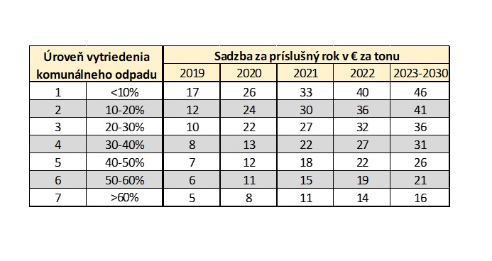 Miera vytriedenia komunálneho odpadu v Malackách bola v roku 2019 38%, nachádzame sa teda v úrovni 4 a sadzba tohto poplatku sa pre nás budúci rok zvyšuje z 13 € na 22 € za tonu.