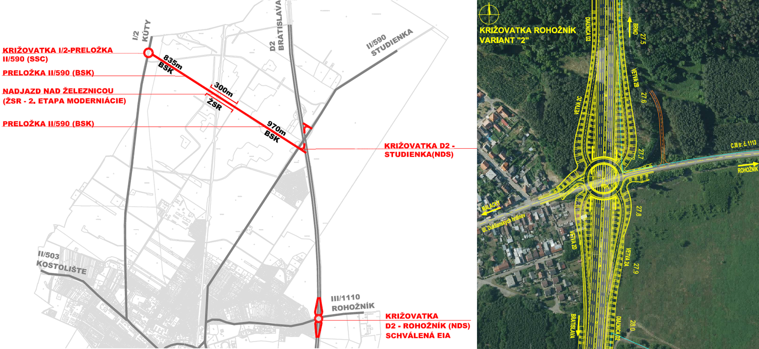 Vľavo schéma začatého riešenia tranzitu cez Malacky s oklonom dopravy na diaľnicu dvomi diaľničnými križovatkami. Vpravo návrh diaľničnej križovatky D2 - Rohožník, ktorá postupuje do tendra na dokumentáciu pre územné a stavebné konanie.