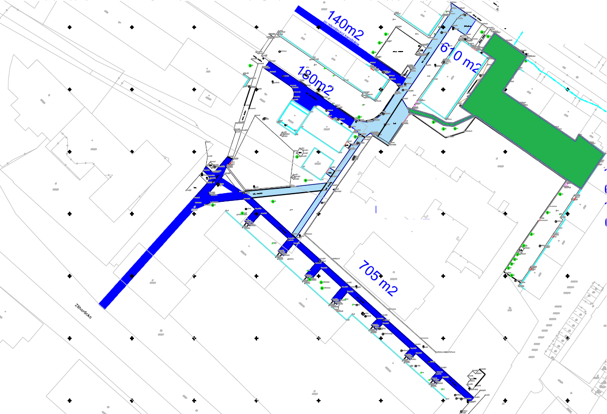 Modrou je znázornený rozsah pripravovanej rekonštrukcie vnútrobloku za Spojenou školou. Zelenou vidno rozsah už zrekonštruovaného vnútrobloku v križovatke Pribinovej ulice a Ul. 1. mája.