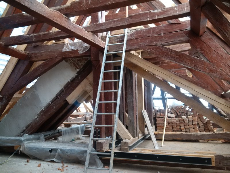 Na fotografii vidno výstavbu novej podpornej konštrukcie komína. Komín musel byť zbúraný, aby sa mohla vymeniť krokva, na ktorej bol jedinečným spôsobom postavený. Obidva komíny boli nanovo vymurované.