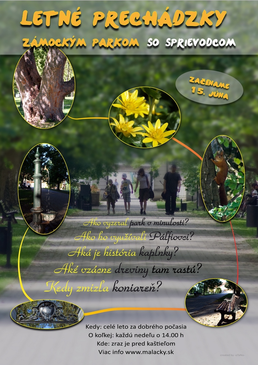 Prechádzky so sprievodcom sa v malackom Zámockom parku začínajú každú nedeľu o 14:00. Exkurzia sa začína pred vstupnou bránou kaštieľa a prevedie návštevníkov celým parkom. Jeho históriou, súčasnosťou, vzácnymi drevinami aj všetkými zaujímavosťami. Sprievodca určite odpovie aj na otázku, kde sa stratila koniareň, ktorá bola kedysi súčasťou kaštieľa.
