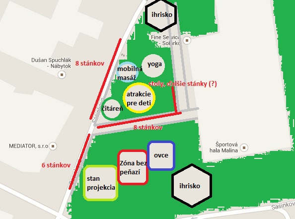 Nákres rozmiestnenia aktivít a stánkov pred Malinou
