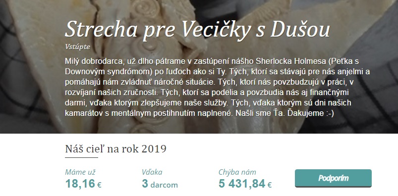 Pridajte sa k bežcom darcovského maratónu aj Vy a vo štvrtok 22. 8. kliknite na projekt Strecha pre Vecičky s Dušou a venujete čiastku neziskovej organizácii Vstúpte, n. o. Vyzbierané peniažky majú prioritne slúžiť na stabilizáciu pracovných miest v chránenej dielni Vstúpte, n. o., kde zamestnávajú ťažko mentálne postihnutých ľudí.