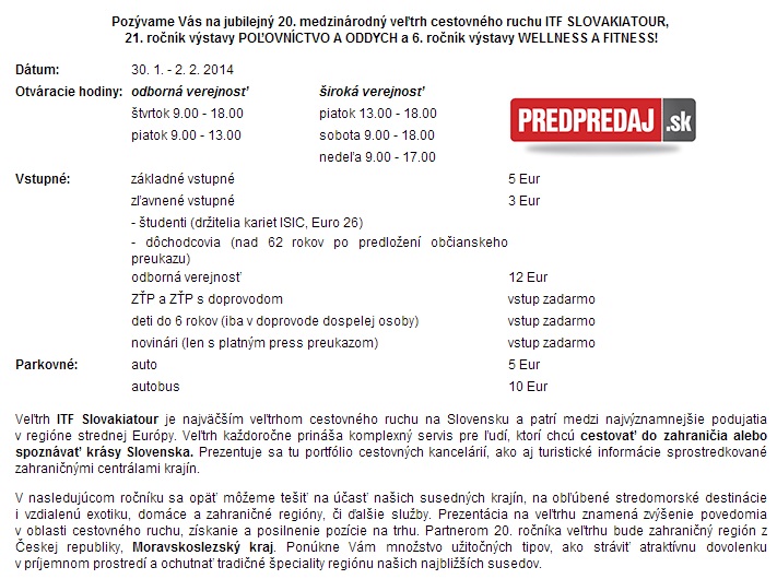 Veľtrh ITF Slovakiatour je najväčším veľtrhom cestovného ruchu na Slovensku a patrí medzi najvýznamnejšie podujatia v strednej Európe. Veľtrh každoročne prináša komplexný servis pre ľudí, ktorí chcú cestovať do zahraničia alebo spoznávať krásy Slovenska. Prezentuje sa tu portfólio cestovných kancelárií, ale aj turistické informácie sprostredkované zahraničnými centrálami krajín.