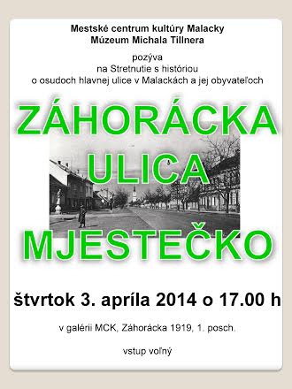 Termín stretnutia je štvrtok 3. apríla 2014 o 17.00 h v galérii MCK (Záhorácka 1919, 1. posch. Pozývame zvlášť obyvateľov (súčasných i bývalých) Záhoráckej ulice a všetkých pamätníkov. Vstup je voľný.